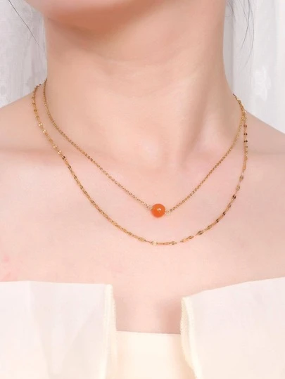 時尚不銹鋼珠子墜飾多層次項鍊適合女士日常裝飾 - 橘色 - 查看 1
