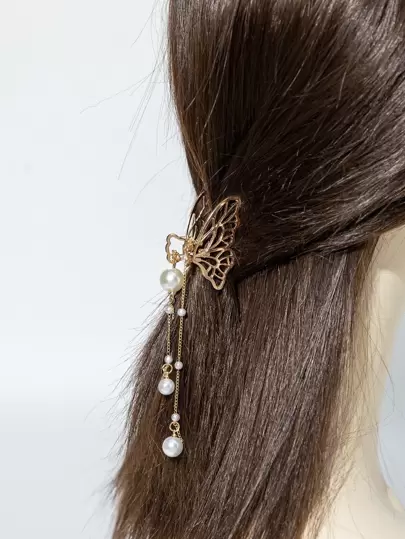 仿珍珠吊饰蝴蝶设计发爪休闲 - 金色 - 查看 1