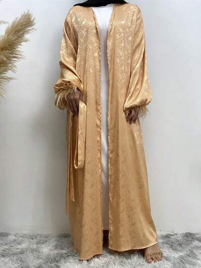 女士羽毛袖口印花缎面中东风格开衫 - 金色 - 查看 1