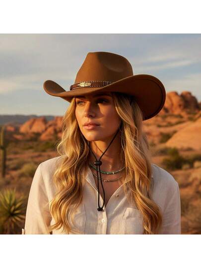 Felt Cowgirl Hat Stylish Decorative Belt Western Hat Wide Brim Jazz Cap For Daily Life  Party - 卡其色 - 查看 1