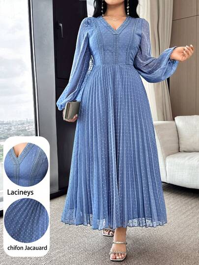Feyla 女士波尔卡圆点印花褶饰V领优雅长袖中长连衣裙
