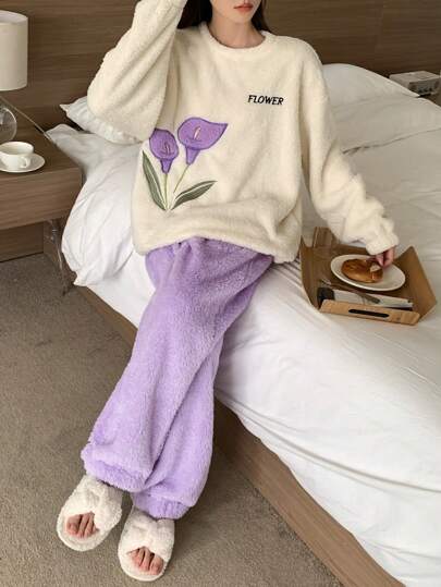 DAZY 法兰绒加厚花卉刺绣装饰睡衣套装,冬季 - 紫色 - 查看 1