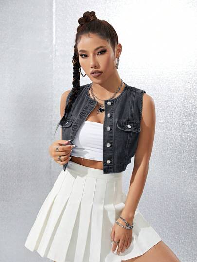 翻蓋細節短款馬甲牛仔夾克 - 灰色 - 查看 1