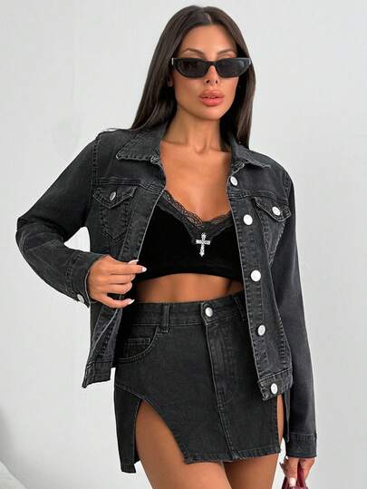 EURMUSE 翻盖口袋纽扣前牛仔夹克