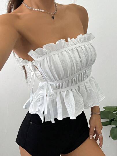 Flirla 休闲/通勤/度假侧蝴蝶结系带褶皱荷叶边抹胸,适合春夏季