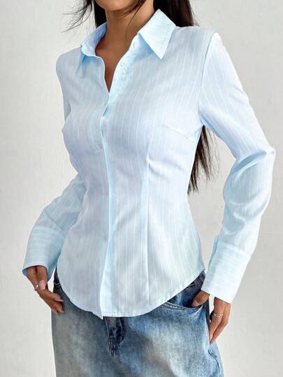 Flirla 休闲条纹褶皱腰衬衫,春秋