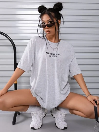 SHEIN Unity 落肩标语刺绣 T 恤 ALL ROADS LEAD TO ROME 图案 T 恤 女士上衣 - 淺灰色 - 查看 1