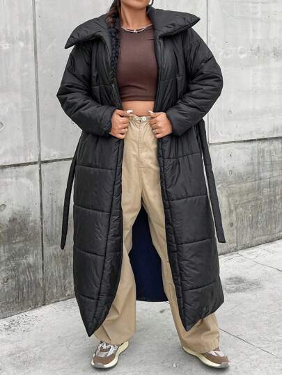 Flirla 加大纯色系带加厚棉服外套冬季 - 黑色 - 查看 7