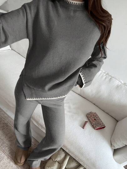 Flirla 女士休闲日常通勤撞色落肩宽松针织毛衣和针织裤两件套,秋冬 - 深灰色 - 查看 1