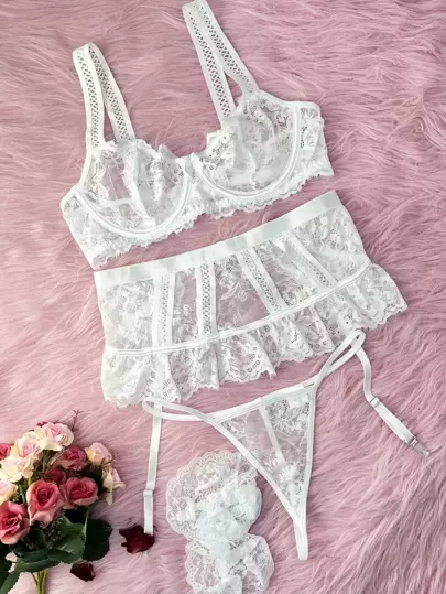 花卉蕾絲鋼圈吊帶襪內衣套裝 - 白色 - 查看 1
