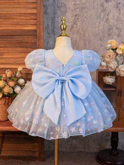 SHEIN Glamorique Kids 花童、生日派对、婚礼节日礼服 - 女婴蓝色泡泡袖连衣裙,可拆卸大蝴蝶结,碎花公主裙,轻盈夏季、海滩、热带风情 - 藍色 - 查看 1