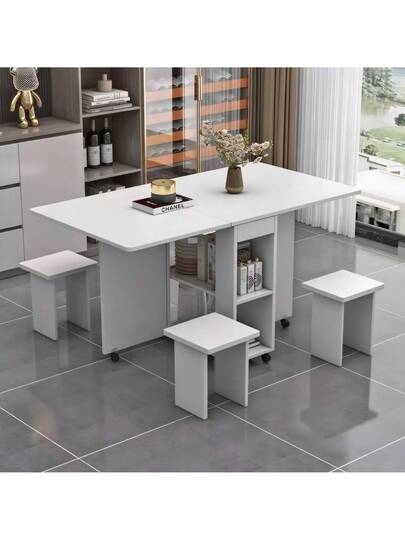 Folding Dining Table Set With 4 Chairs / Dining Table With Storage / Space-Saving Design / With 6 Wheels / Suitable For Family Gatherings And Afternoon Tea, White