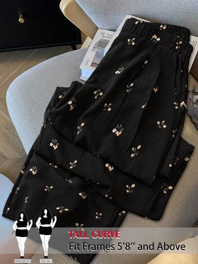 SHEIN Tall CURVE 大码女式碎花口袋阔腿宽松裤 - 黑色 - 查看 1