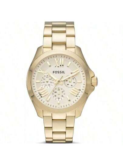 Fossil 女士石英不锈钢三针腕表,不锈钢表壳/防刮玻璃镜面,馈赠亲友的珍贵之选。AM4510 - 金色 - 查看 1