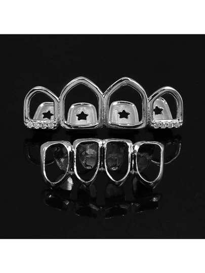 四個全開面空心牙齒格柵頂部帶CZ和底部牙齒格柵男士銅銀色身體首飾 - 銀色 - 查看 8