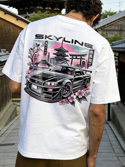 Fractyr Fractyr 男士时尚印花宽松短袖T恤 | 精致设计 | 赛车与樱花印花 | 夏季必备 | 易于搭配,展现您的风格 - 白色 - 查看 1