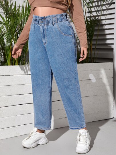 SHEIN Essnce 大碼紙袋腰牛仔褲 - 淺色水洗藍 - 查看 1