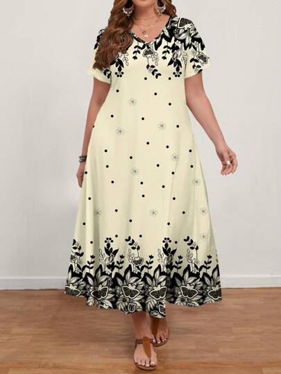 EMERY ROSE 大码女式休闲蝴蝶结碎花 V 领短袖连衣裙,适合夏季 - 米色 - 查看 1