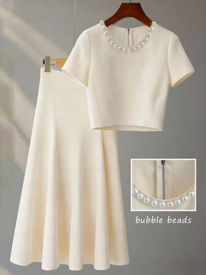 Franclia 2件套法式优雅3D串珠短袖上衣和层叠半裙套装,米色,夏季女装 - 米色 - 查看 2