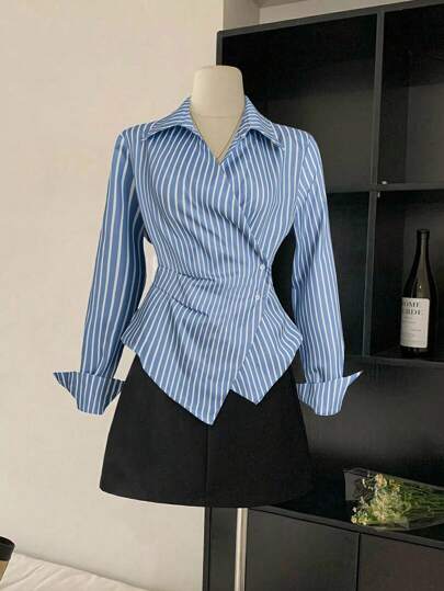 Franclia 不对称腰部修身条纹长袖女衬衫 - 藍色 - 查看 1