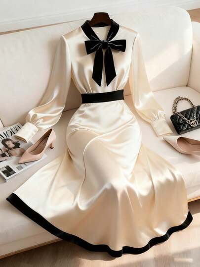Franclia 女士休闲圆领蝴蝶结腰部拼接长袖中长连衣裙 - 杏色 - 查看 1