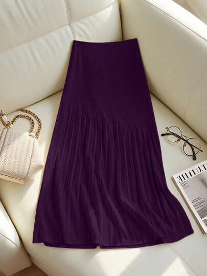 Franclia 新款褶裥拼接针织半身裙,高腰显瘦毛衣裙,A字休闲女裙 - 紫色 - 查看 1