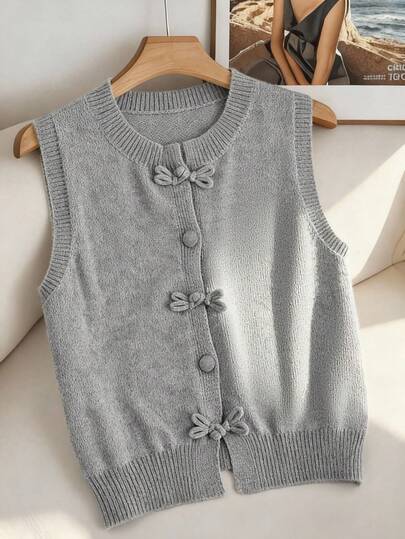Franclia 大码纯色无袖背心,中国风手工纽扣短款法式休闲圆领灰色开衫毛衣,适合春、夏、秋、冬四季穿着。