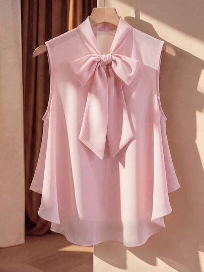 SHEIN Franclia 大码女士优雅纯色雪纺面料蝴蝶结系带A字娃娃衫,无袖,百搭设计,适合度假、音乐会、时尚外出、派对、约会之夜、情人节等场合。