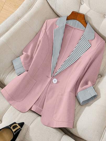 Franclia 女士条纹长袖前扣西装外套,秋冬季休闲办公装 - 粉色 - 查看 1