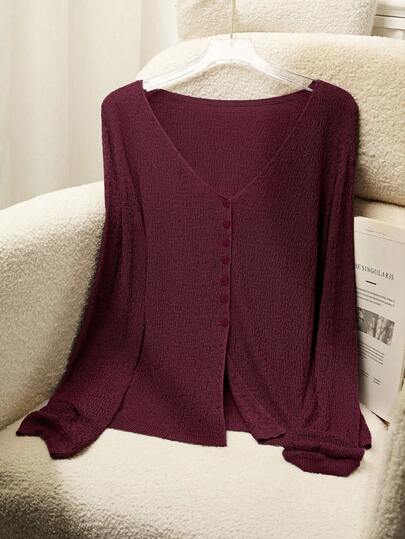 Franclia 女士休闲半透明 V 领开衫、混合纱线针织毛衣、春夏 - 酒紅色 - 查看 1