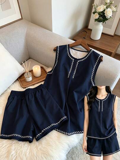 Franclia 女士优雅休闲简约印花纯色无袖上衣+短裤两件套