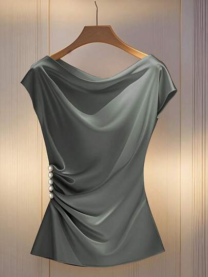Franclia 女士优雅褶皱珍珠纽扣短袖荷叶领修身衬衫 - 霧霾藍 - 查看 1