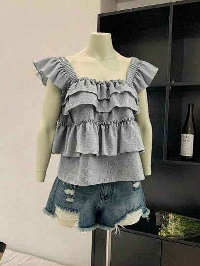 Franclia 女士纯色短袖荷叶边下摆休闲上衣,适合度假穿着