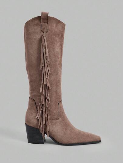 Ontre 法式小众流苏长靴女款时尚宽筒修身百搭及膝长靴秋冬 - 棕色 - 查看 1