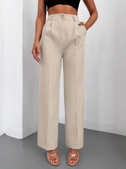 EURMUSE 法式風格純色斜口袋直筒長西褲 - 杏色 - 查看 1