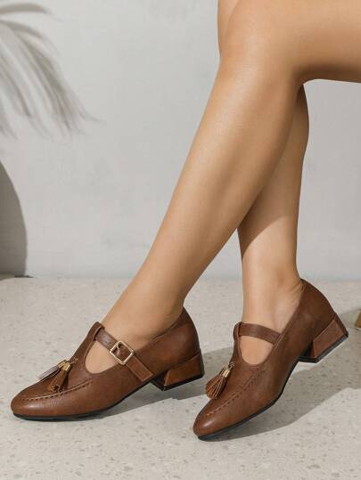 法式复古舒适圆头平底鞋,春秋季系带女式平底鞋,玛丽珍鞋 - 棕色 - 查看 1
