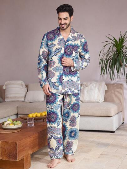 Manfinity ChillVibe 2 件男士花卉印花翻领单排扣长袖上衣和裤子家居服套装 - 彩色 - 查看 1