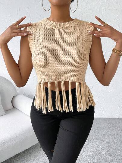 SHEIN Essnce 流蘇裝飾短款毛衣馬甲 - 卡其色 - 查看 1