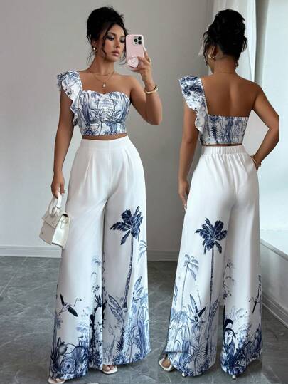 Elenzga 2 件套女式阔腿裤和花朵印花背心,休闲装 - 彩色 - 查看 1
