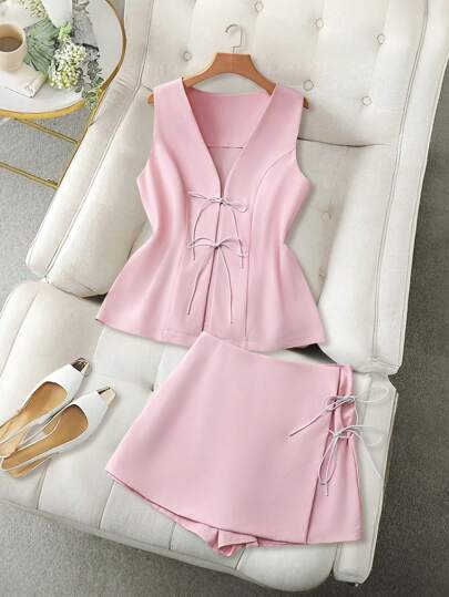 GlowEve CURVE 2 件女式纯色梭织修身无袖上衣 + A 字裙套装,优雅夏日装 - 粉色 - 查看 2