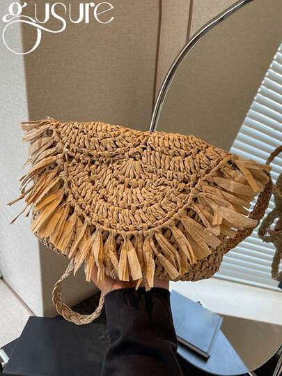 手工草编流苏斜挎包女士复古手提包旅行沙滩手机钱包女式单肩包夏季女士草编包手工流苏沙滩包2025拉菲草藤条编织手提包度假单肩斜挎包手拿包 - 卡其色 - 查看 1