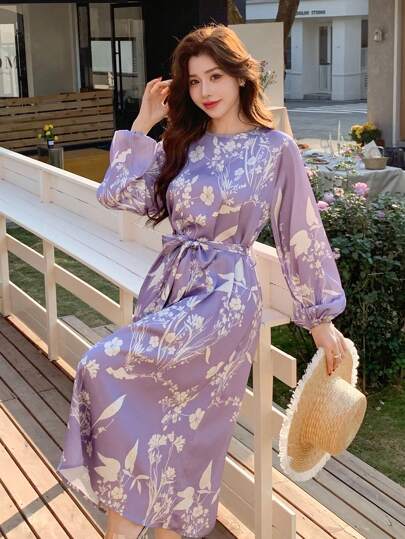 DAZY 女士全花卉印花中式领中长连衣裙,秋季连衣裙 - 紫色 - 查看 1