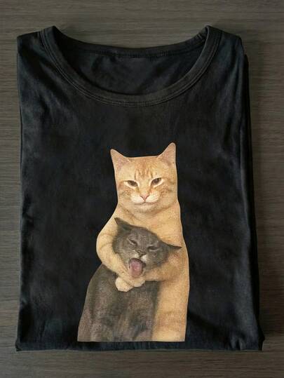 趣味猫咪贴纸印花短袖T恤,可爱独特的小批量设计,大码女式T恤,大码日常女装,柔软面料,大码舒适圆领休闲上衣,复古黑色T恤,大码女装,春夏服装。 - 黑色 - 查看 1