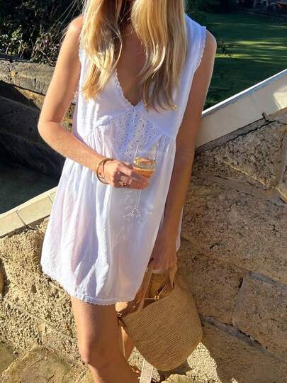 Womens Lace Trim V Neck Mini Dress Y2k 90s Vintage Aesthetic Summer Flowy Swing Dress Going Out Boho Coquette A Line Dress - 白色 - 查看 1