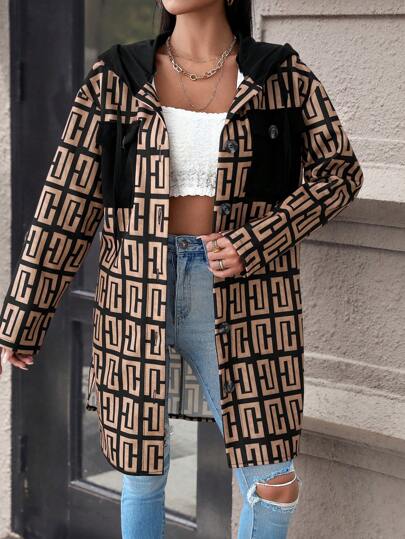 Chiquease 滿版印花落肩袖翻蓋口袋連帽外套 - 棕色 - 查看 1