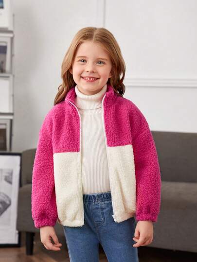 SHEIN 女小童雙色落肩袖毛絨夾克 - 彩色 - 查看 1