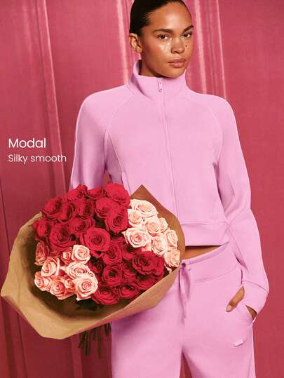 GLOWMODE SoftSerene 莫代尔撞色滚边腰部拇指孔修身拉链卫衣,适合日常休闲穿着,秋冬款 - 粉色 - 查看 1