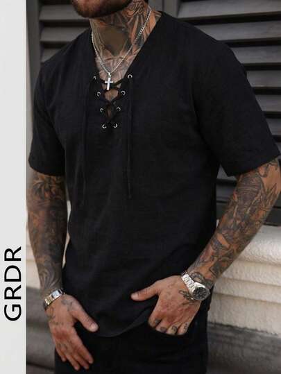 GRDR 男士休闲亚麻 V 领落肩 T 恤 | 精致设计 | 夏季必备 | 易于搭配,展现您的风格 - 黑色 - 查看 1