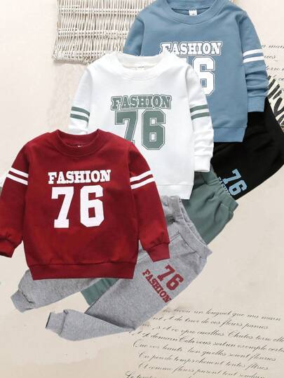 SHEIN 年轻男孩 6 件套休闲运动学院街头风格可爱 76 数字字母印花运动衫和长裤,适合日常穿着、学校、户外、运动、春秋季节的衣服 - 彩色 - 查看 6