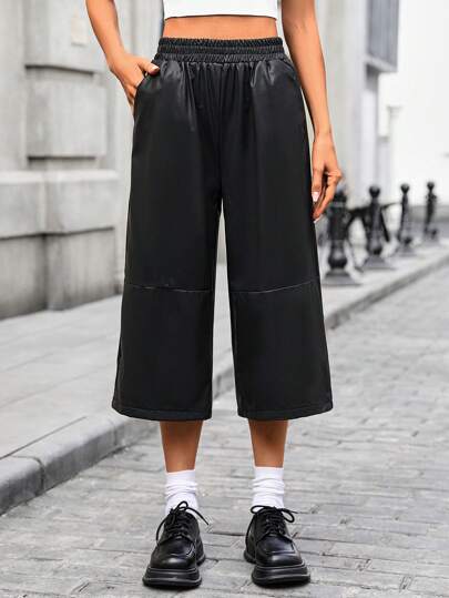 弹力腰部 PU 皮 3/4 裤,新款夏季薄款时尚百搭黑色简约宽松阔腿裤 - 黑色 - 查看 1